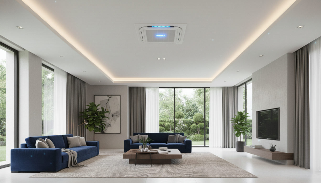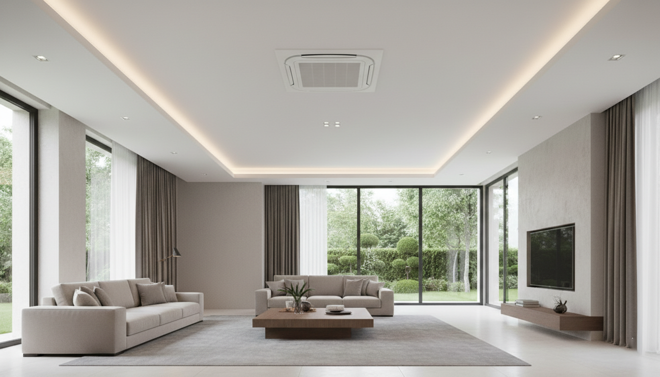 Một không gian phòng khách biệt thự hiện đại với trần thạch cao phẳng, ở giữa là chiếc điều hòa âm trần Cassette mặt nạ trắng đồng điệu với màu trần. Hình ảnh cho thấy sự tinh tế khi máy hòa quyện hoàn hảo vào kiến trúc nội thất.