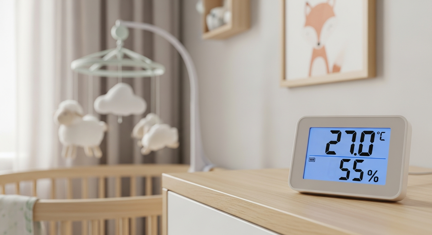 Hình ảnh một nhiệt kế và ẩm kế điện tử đặt trong phòng trẻ nhỏ, hiển thị nhiệt độ 27 °C và độ ẩm 55%.
