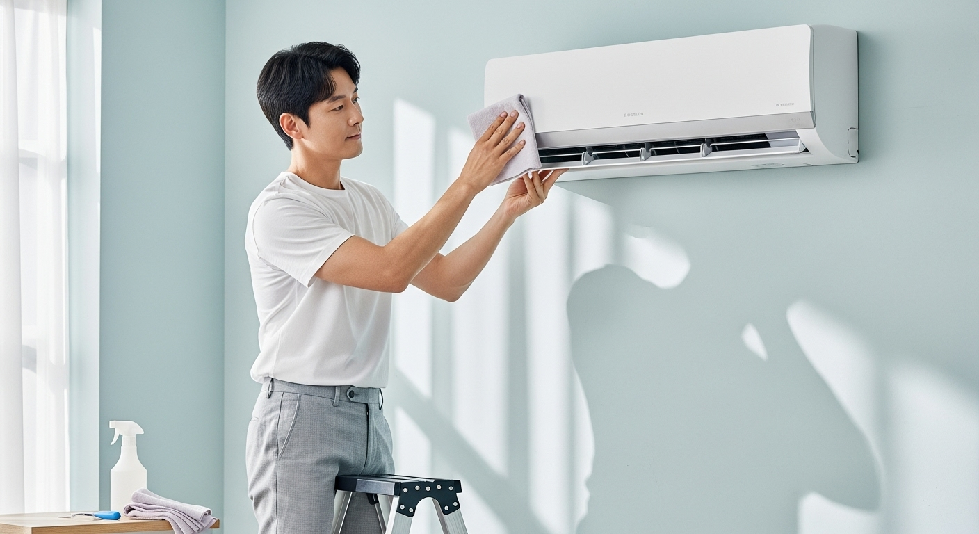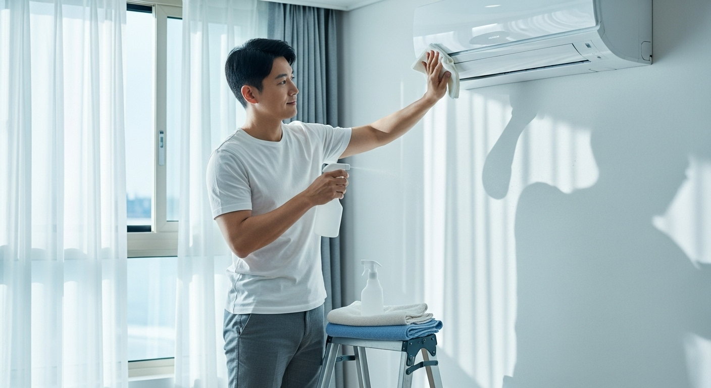 Hình người đang vệ sinh điều hòa treo tường bằng khăn và bình xịt