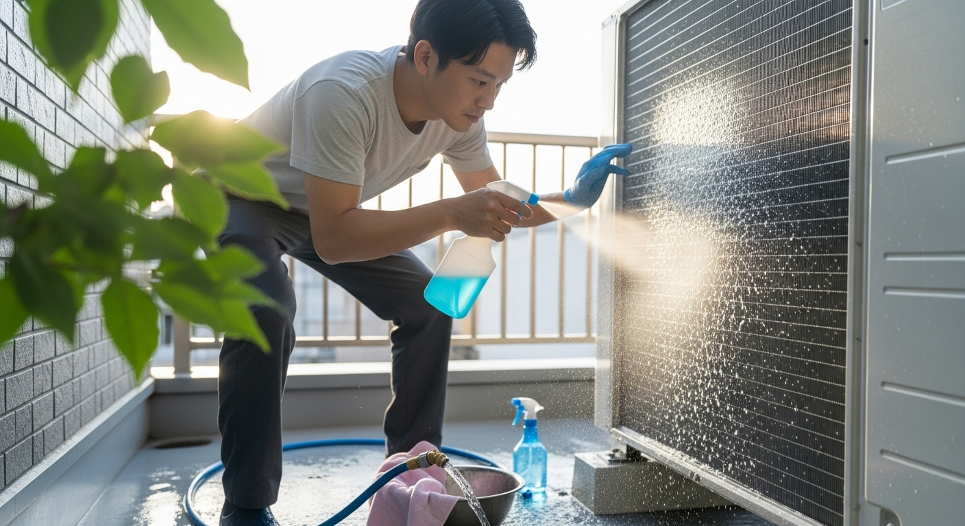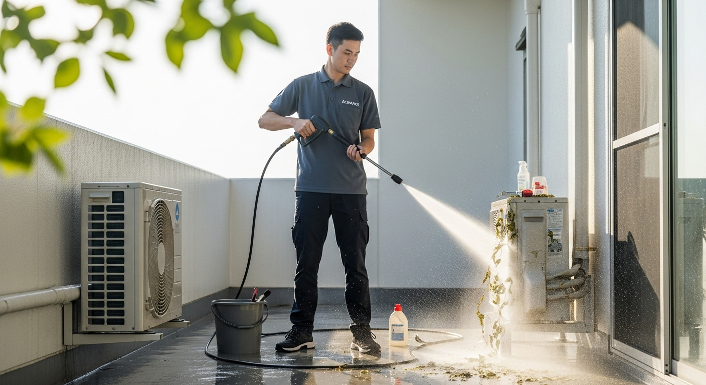 Kỹ thuật viên đang xịt rửa dàn nóng ngoài trời