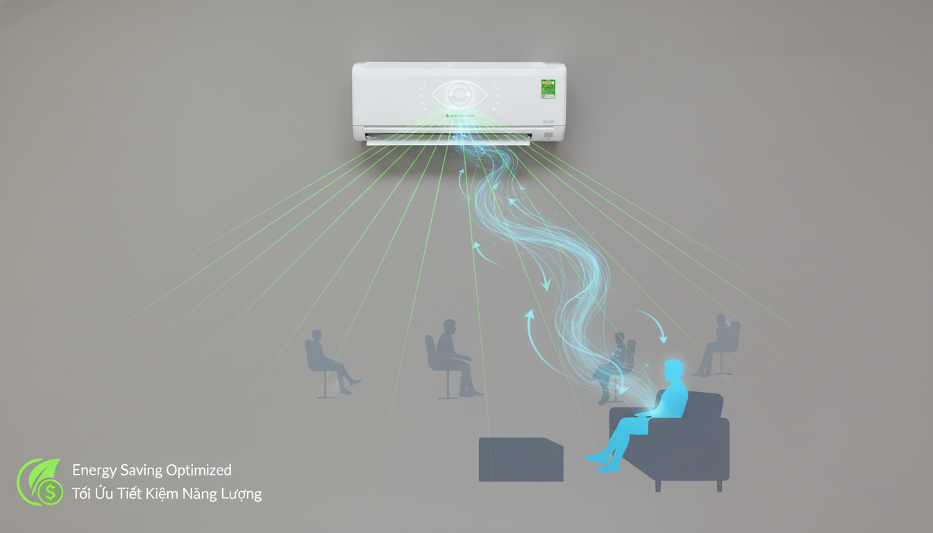 Nguyên lý làm mát mục tiêu: Các tia cảm biến từ máy lạnh quét khắp phòng, xác định vị trí người dùng để điều chỉnh luồng khí, thể hiện sự tối ưu trong việc sử dụng năng lượng.