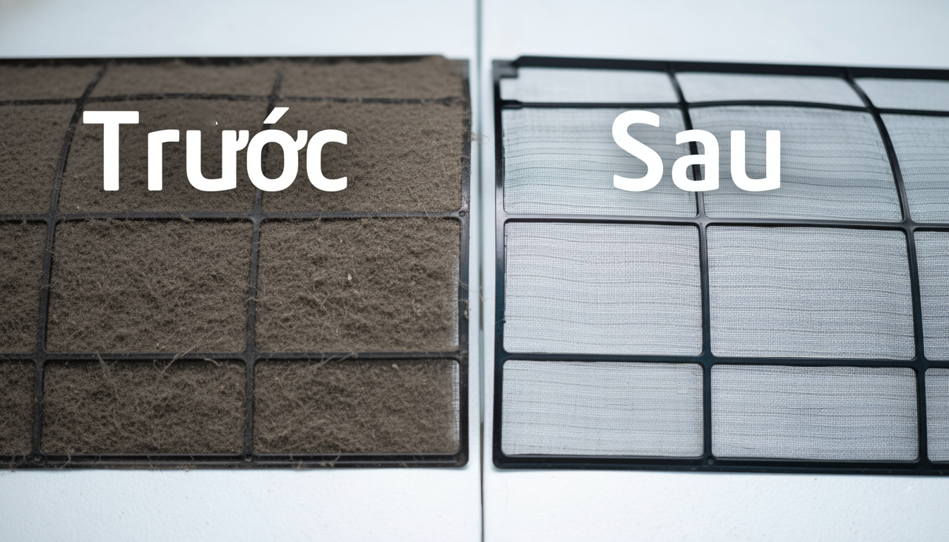 Hình ảnh so sánh giữa lưới lọc điều hòa sạch và bẩn, kèm theo thông điệp về việc vệ sinh định kỳ giúp máy vận hành trơn tru và tiết kiệm điện năng hơn.