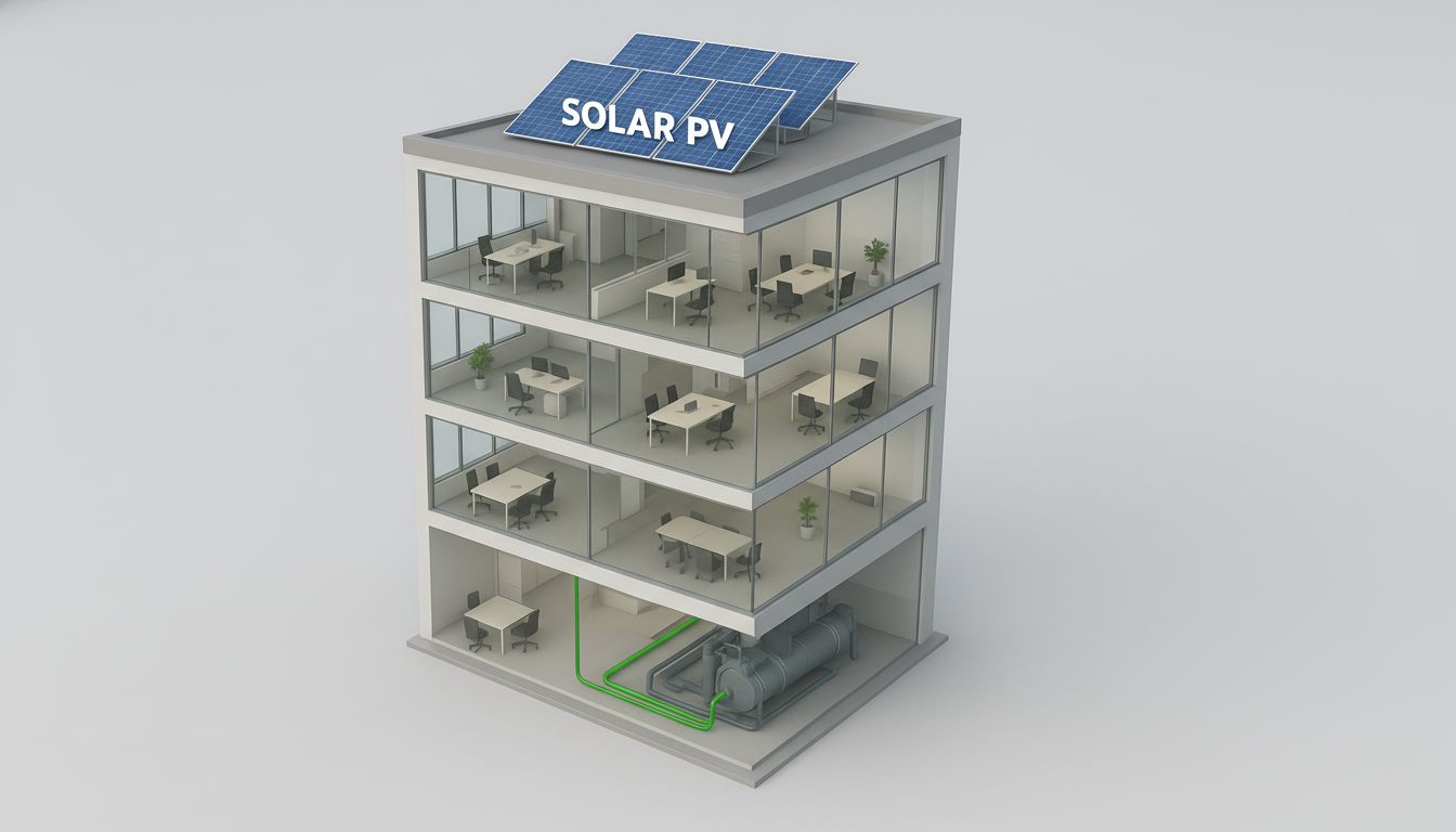 Mô hình đồ họa 3D cắt lớp của một tòa nhà văn phòng hiện đại. Trên mái nhà là các tấm pin năng lượng mặt trời (Solar PV) lớn. Các đường dây điện màu xanh lá cây kết nối trực tiếp xuống tầng kỹ thuật nơi đặt hệ thống Chiller Bơm nhiệt, minh họa cho sự đồng bộ giữa nguồn và tải.