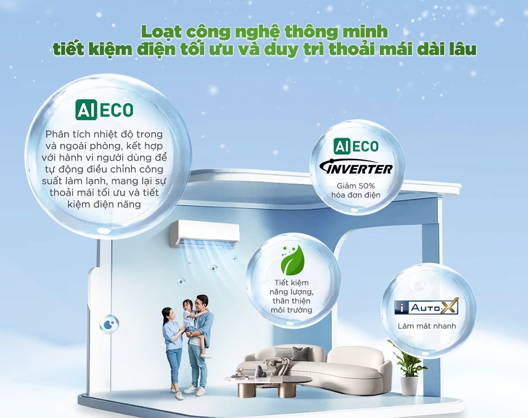 Công suất làm lạnh cần thiết. Từ đó, AI sẽ điều chỉnh công suất hoạt động tối ưu nhất để vừa đảm bảo mát lạnh tức thì, vừa tiết kiệm điện đến 20%.