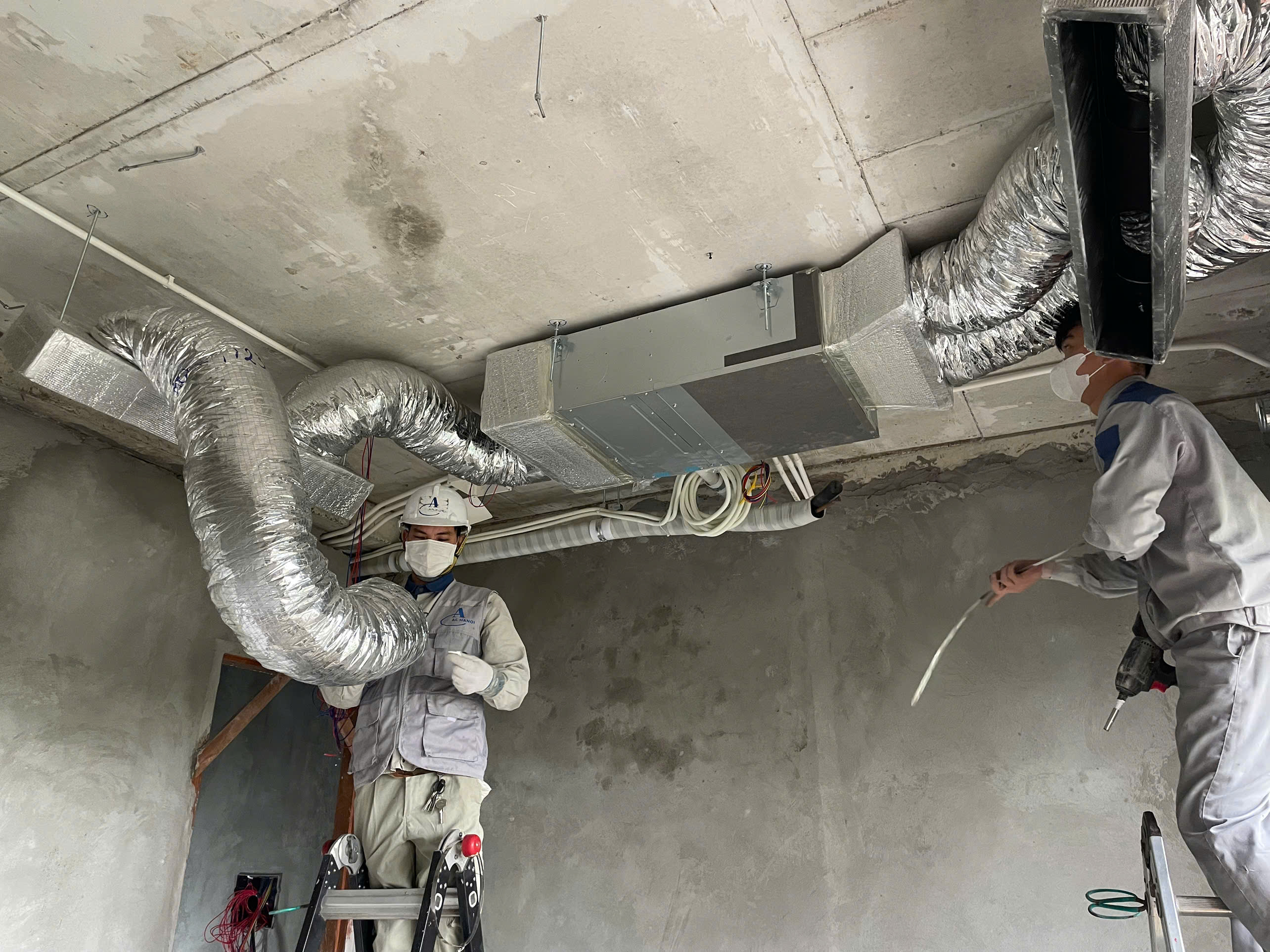 Đội ngũ kỹ thuật viên ACHANOI đang tiến hành lắp đặt hệ thống ống gió điều hòa trung tâm Panasonic
