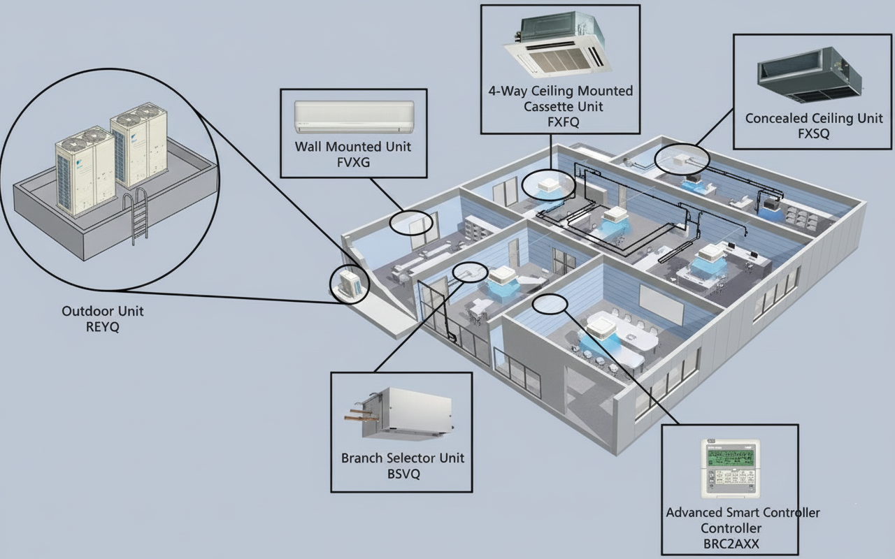Sơ đồ nguyên lý hoạt động của hệ thống VRV. Hình ảnh hiển thị một dàn nóng duy nhất đặt trên mái nhà, từ đó các đường ống đồng nhỏ gọn chạy qua các phòng. Mỗi phòng có một dàn lạnh độc lập (cassette hoặc treo tường) và có thể điều khiển nhiệt độ riêng biệt.