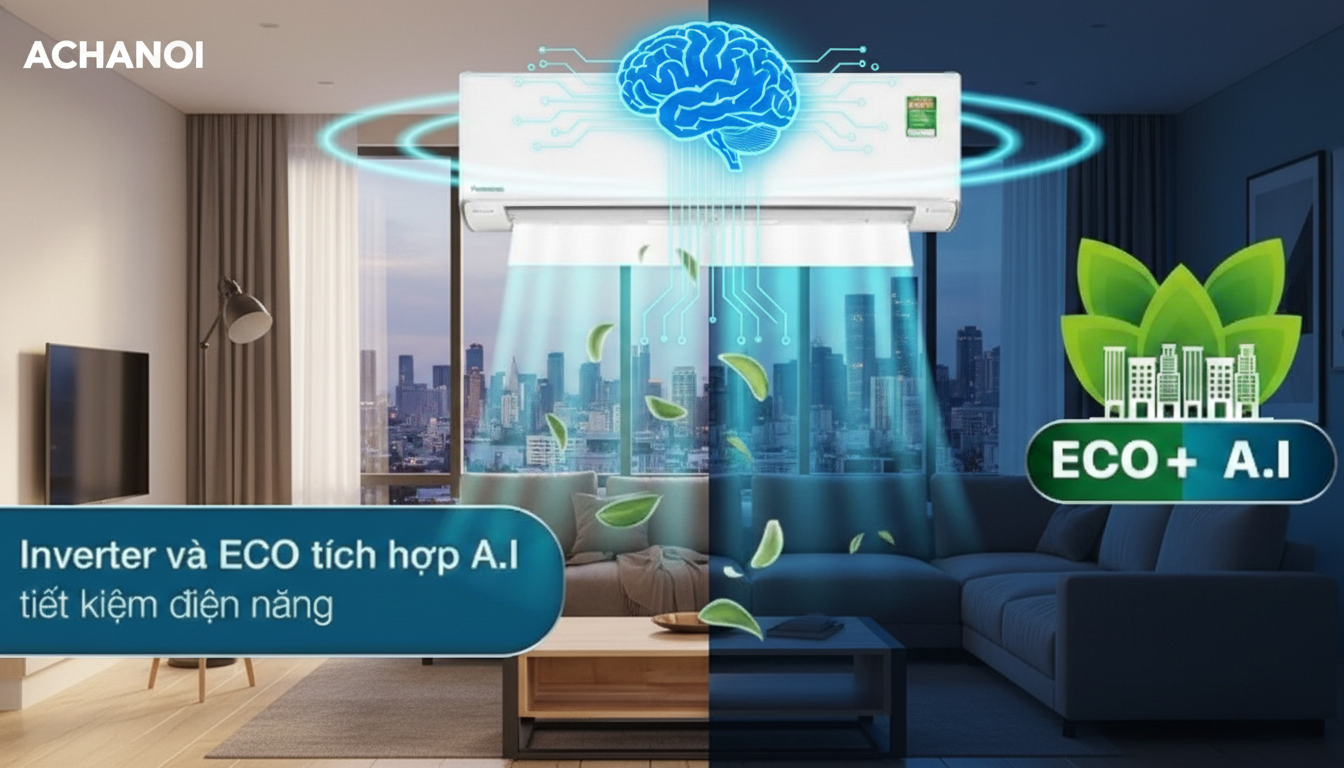 Nếu Inverter là nền tảng, thì AI ECO trên dòng máy lạnh Panasonic 2026 là "bộ não" chỉ huy thông minh nhất. Đây là công nghệ tiên tiến nhất giúp dòng sản phẩm mới này tại ACHANOI cắt giảm hóa đơn tiền điện một cách ngoạn mục.
