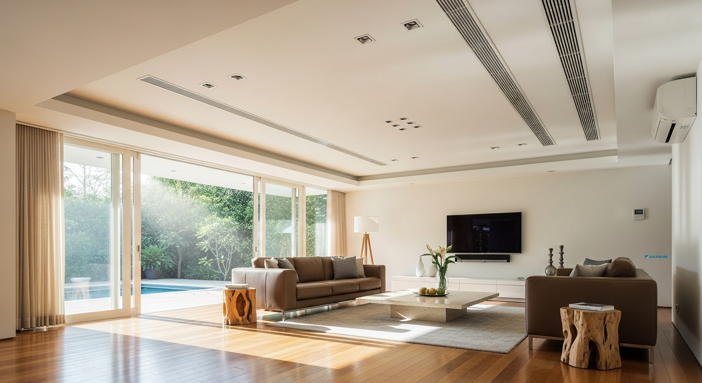 Hệ thống điều hòa trung tâm VRV Daikin được lắp đặt âm trần hoàn toàn, chỉ để lộ các miệng gió tinh tế, giúp không gian trở nên gọn gàng, sang trọng và nâng tầm giá trị thẩm mỹ của nội thất biệt thự. Đây chính là yếu tố tạo nên sự khác biệt của một không gian sống đẳng cấp: tiện nghi hiện đại nhưng vô hình, không làm phá vỡ tổng thể thiết kế.