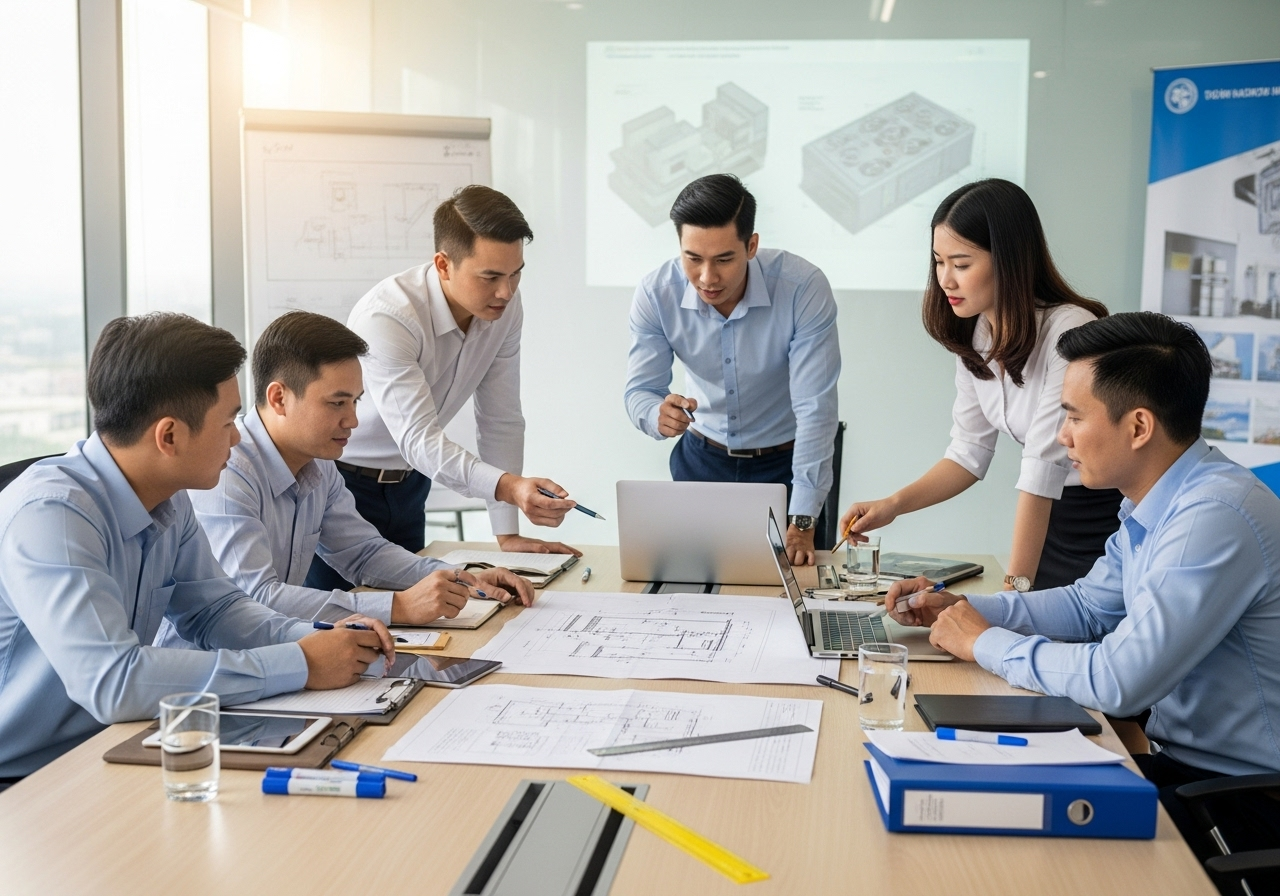 Hình ảnh một đội ngũ kỹ sư đang họp, thảo luận về bản vẽ thiết kế