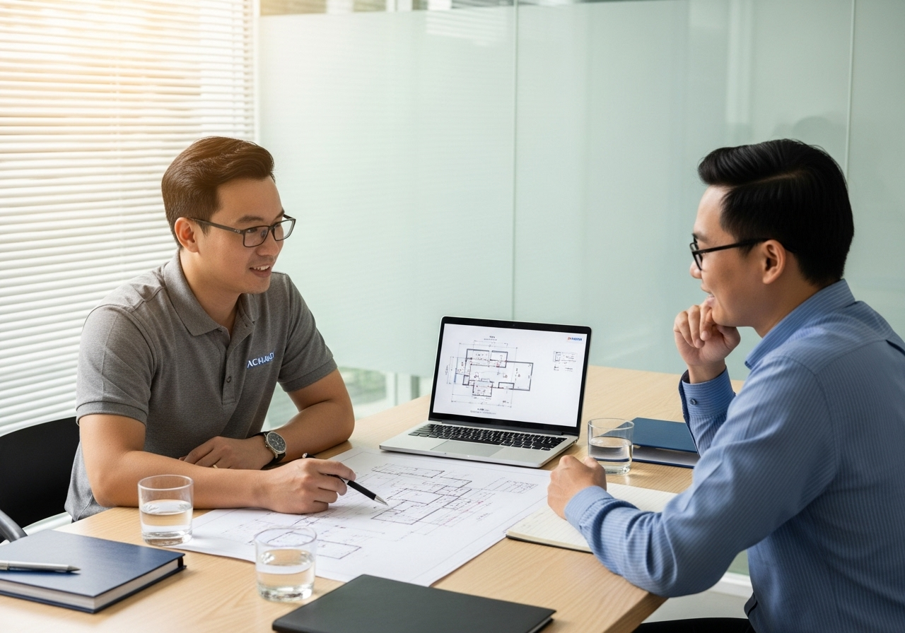 Kỹ sư của AC Hà Nội đang làm việc với khách hàng, trao đổi về bản vẽ