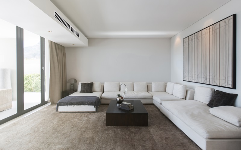 Một phòng khách biệt thự hiện đại với trần thạch cao phẳng, các khe gió màu đen tinh tế chạy dọc trần nhà, không hề thấy bóng dáng của máy điều hòa truyền thống.
