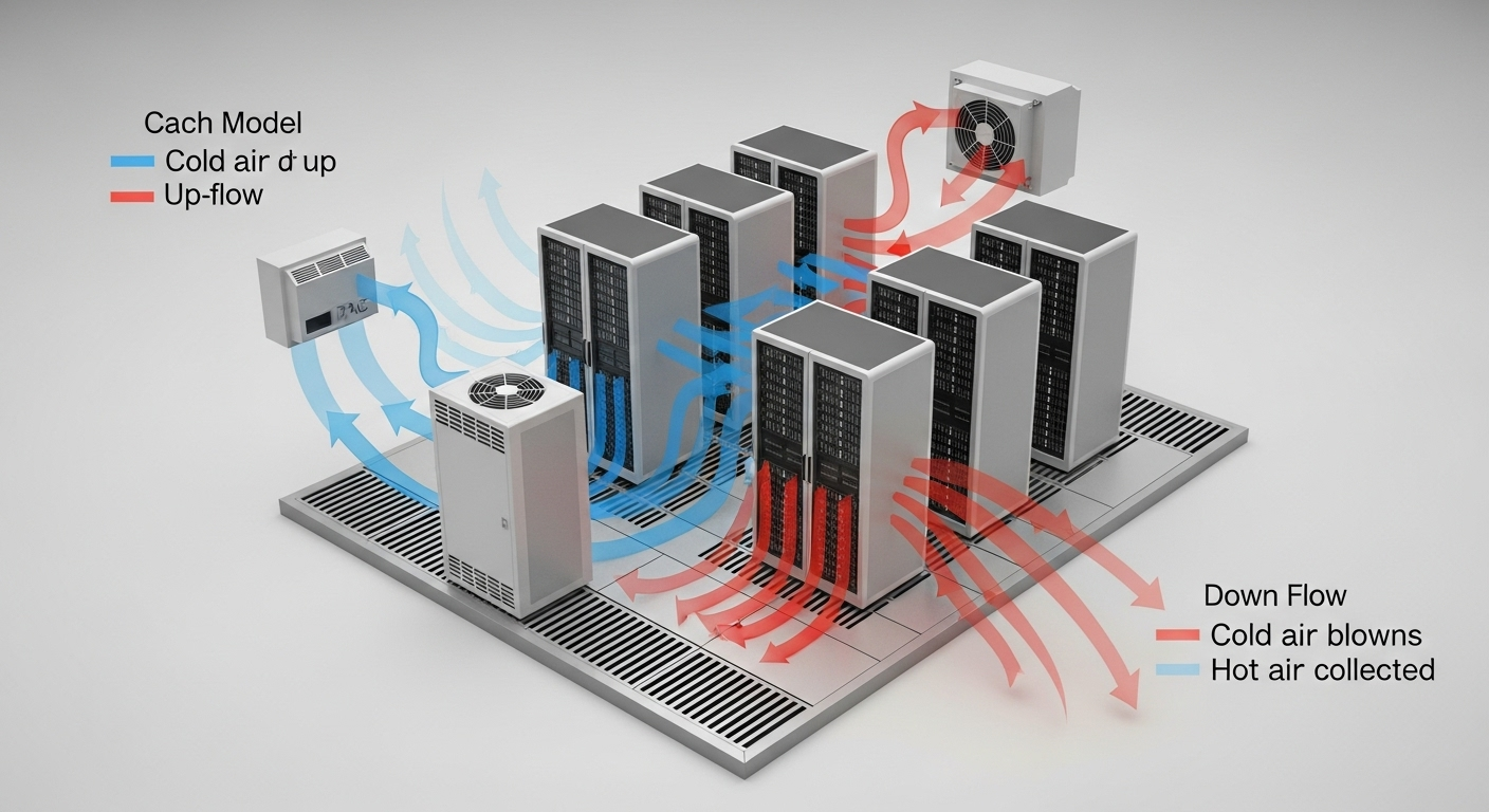 PAC thường sử dụng luồng không khí đi từ dưới lên trên (Up-flow) hoặc từ trên xuống dưới (Down-flow), đặc biệt là kết hợp với Sàn nâng kỹ thuật (Raised Floor) trong Data Center. Không khí lạnh được thổi qua sàn nâng, đi thẳng vào các tủ thiết bị (tủ Rack), tạo ra hành lang lạnh và hành lang nóng riêng biệt, nâng cao hiệu quả làm mát tập trung.
