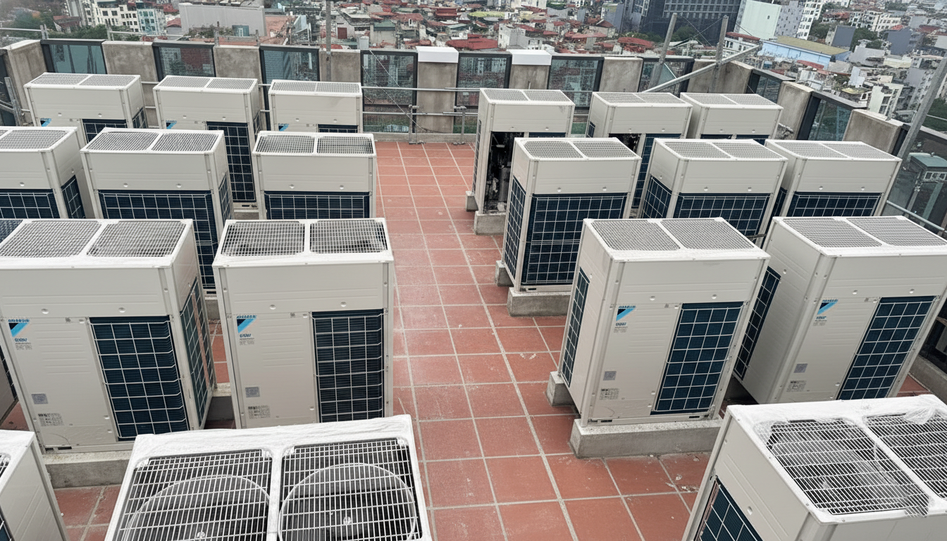 Cận cảnh dàn nóng điều hòa ACHANOI đặt trên sân thượng tòa nhà với hệ thống cánh quạt lớn và dàn tản nhiệt hiện đại, thể hiện sự mạnh mẽ của thiết bị.