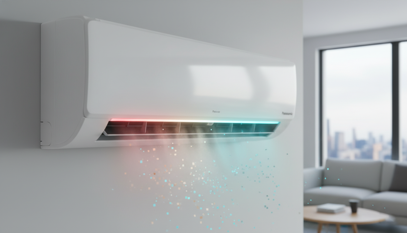 Hình ảnh cận cảnh mặt nạ dàn lạnh Panasonic dòng XU với dải đèn LED Clean Air Indicator đang chuyển từ màu đỏ sang xanh, minh họa cho quá trình làm sạch không khí trong phòng khách hiện đại