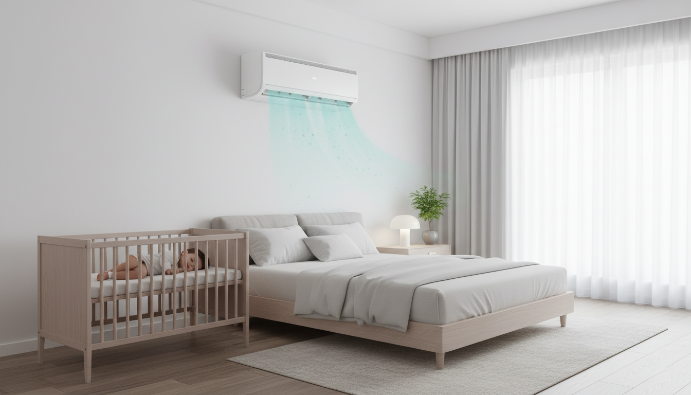 Hình ảnh không gian phòng ngủ hiện đại với một chiếc điều hòa được lắp đặt tinh tế, bên dưới là một em bé đang ngủ ngon lành, thể hiện sự an tâm và thoải mái tối đa.