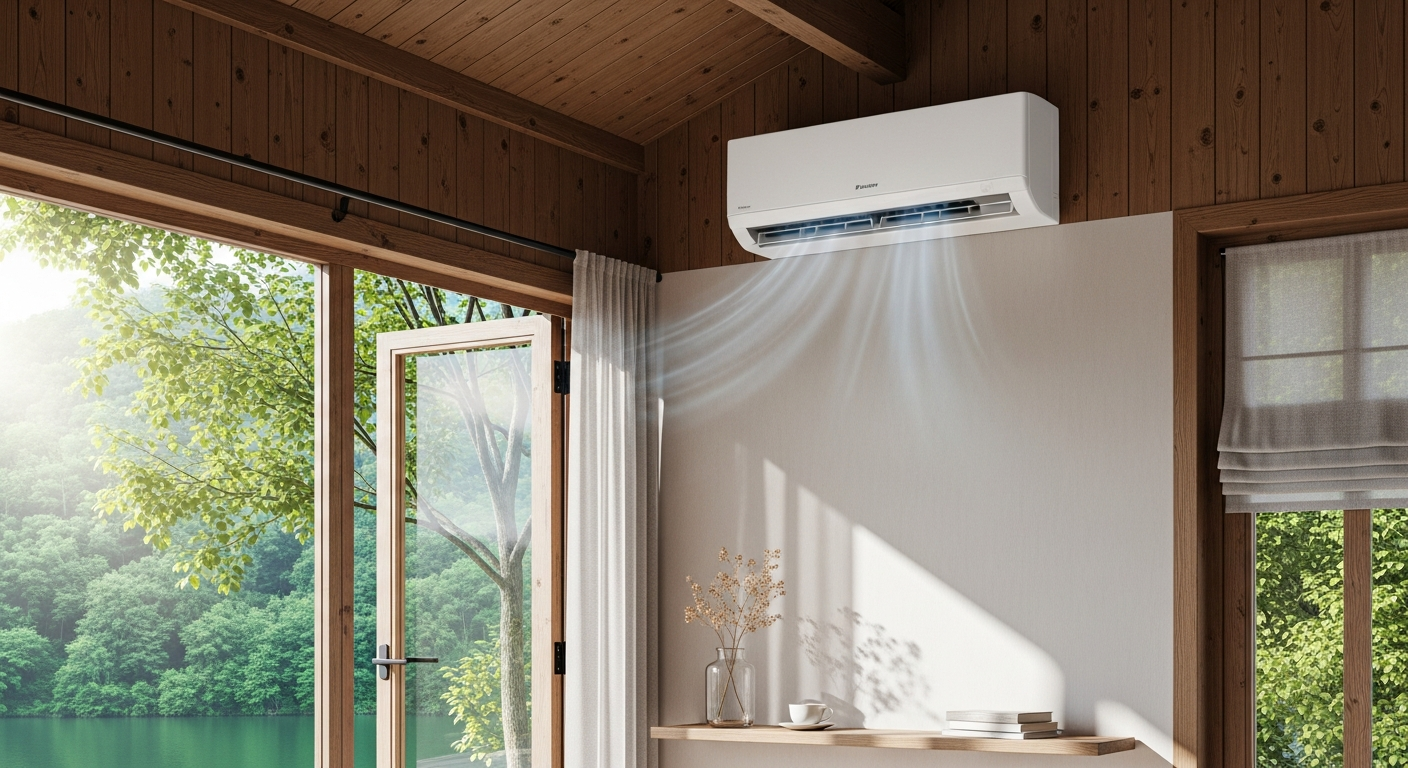 Cận cảnh dàn lạnh Daikin/Panasonic lắp trong bungalow gỗ, cửa sổ nhìn ra rừng hoặc hồ, không khí thoáng đãng.