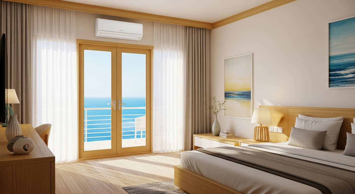 Không gian phòng nghỉ hướng biển, ánh sáng tự nhiên chiếu qua rèm, điều hòa treo tường tinh tế hòa vào tổng thể nội thất gỗ sáng.