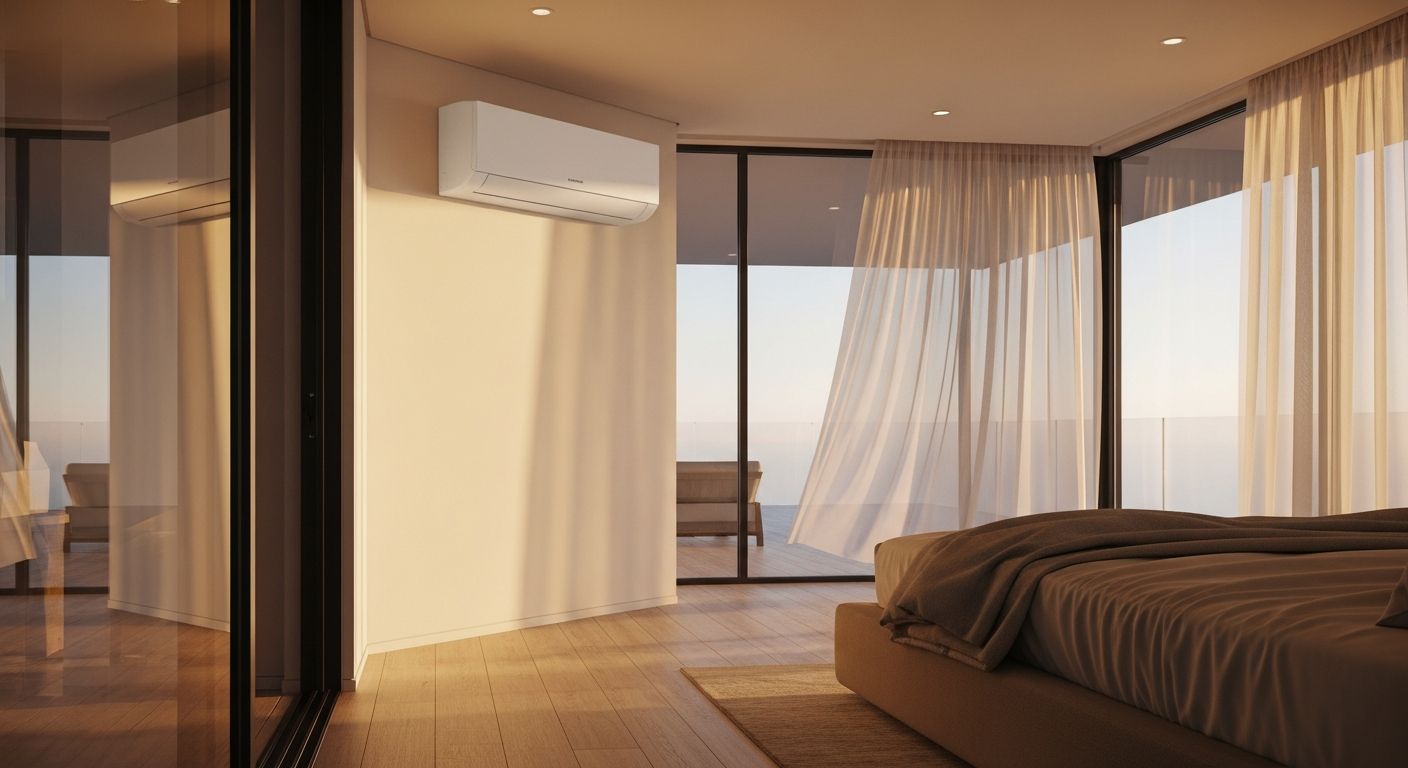 Không gian villa nghỉ dưỡng hiện đại, điều hòa treo tường bố trí khéo léo, ánh sáng chiều nhẹ xuyên qua cửa kính.