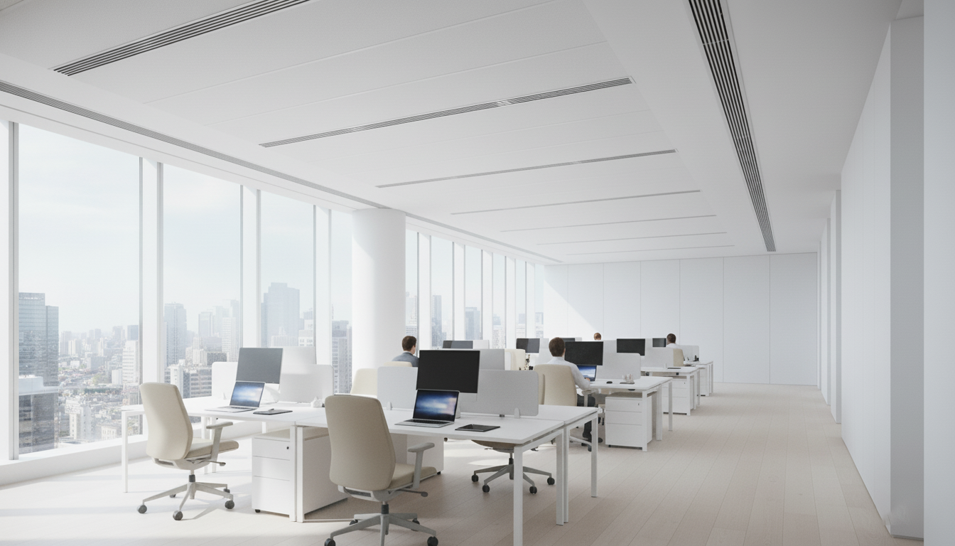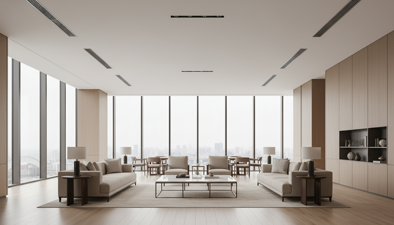Một không gian phòng khách hoặc sảnh khách sạn sang trọng, trần nhà thạch cao phẳng, chỉ nhìn thấy các khe gió dài và hẹp (slot diffuser) mảnh dẻ, hoàn toàn không thấy bất kỳ dàn lạnh treo tường nào. Nhấn mạnh sự tinh tế và tối giản.