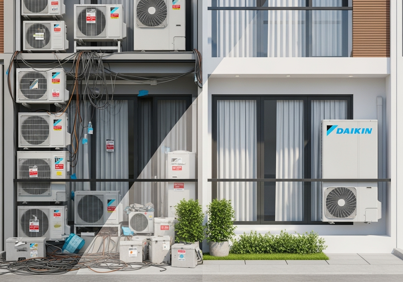 Các hệ thống điều hòa cục bộ truyền thống thường gây mất mỹ quan với nhiều cục nóng treo ngoài mặt tiền, chiếm diện tích ban công và tiêu tốn điện năng. Đây chính là lý do giải pháp điều hòa trung tâm (Multi và VRV/VRF) đang trở thành sự lựa chọn hàng đầu cho các dự án nhà phố, mang lại không gian sống hoàn hảo và tiện nghi.