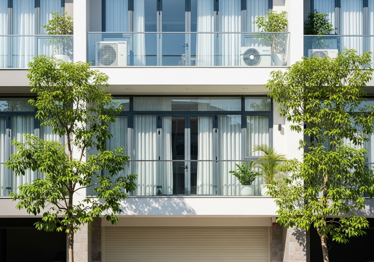 Một căn nhà phố hoặc biệt thự phố với kiến trúc hiện đại, không thấy nhiều cục nóng điều hòa