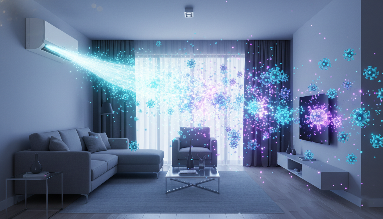 Hình ảnh đồ họa 3D mô tả luồng khí từ điều hòa thổi ra mang theo các hạt ion phát sáng (màu xanh hoặc tím). Các hạt ion này đang bao vây và tiêu diệt các virus (hình cầu có gai) lơ lửng trong không gian phòng khách hiện đại.
