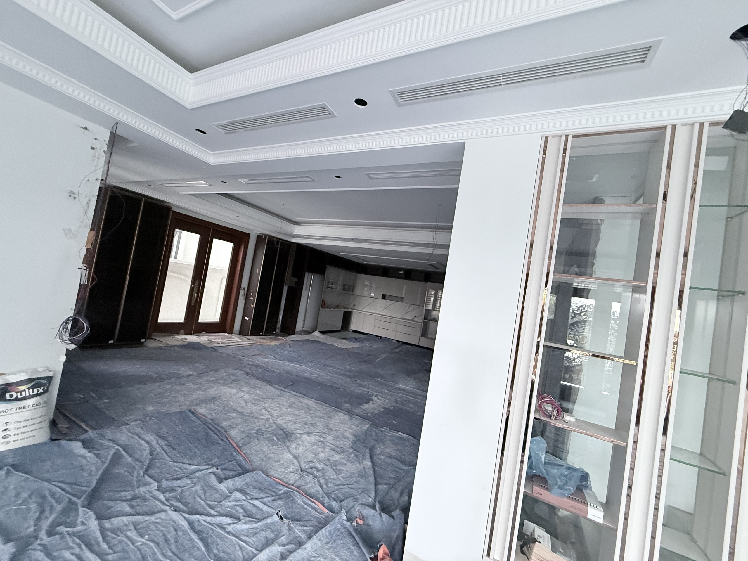 Bối cảnh là một phòng khách biệt thự đang trong giai đoạn hoàn thiện nội thất.