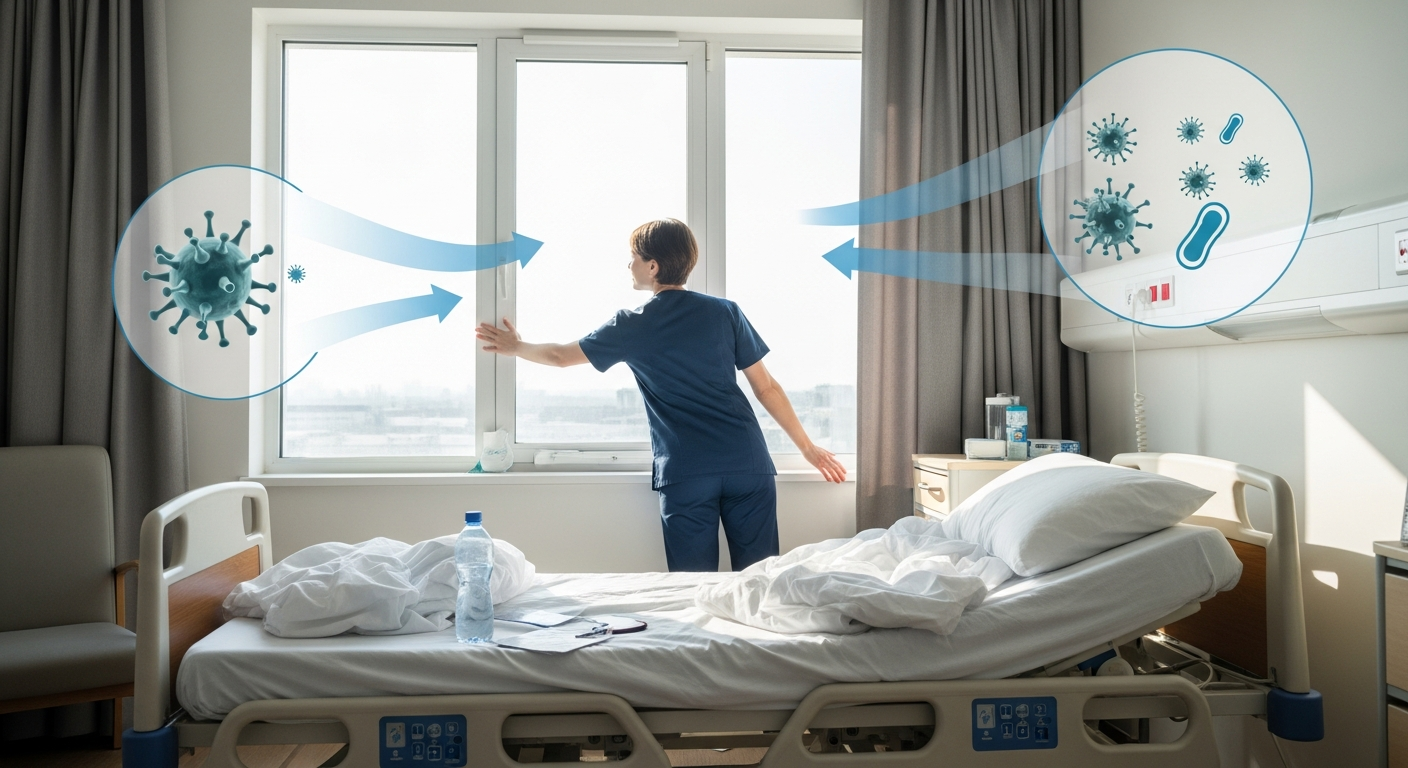 Hình ảnh người chăm sóc đang mở cửa sổ phòng bệnh để thông gió, nhấn mạnh nguyên tắc trao đổi không khí định kỳ