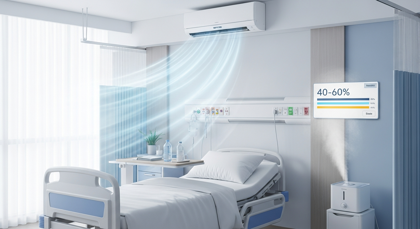 Hình ảnh phòng bệnh có điều hòa Inverter và máy tạo ẩm, minh họa sự kết hợp thiết bị để duy trì độ ẩm lý tưởng