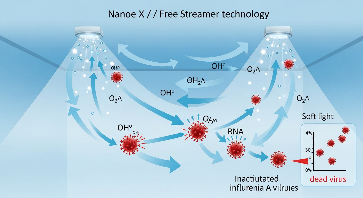Sơ đồ hoạt động của công nghệ Nanoe X hoặc Streamer, giải thích cách các ion/gốc tự do tấn công và vô hiệu hóa virus cúm A trong không khí