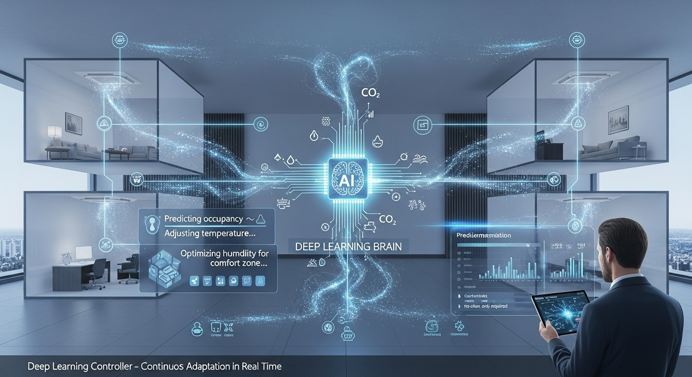 Ví dụ: Nếu nhiệt độ phòng là 26∘C nhưng độ ẩm 75%, mô hình tĩnh PMV có thể báo hài lòng thấp. AI/DL sẽ nhận thấy rằng nếu máy nén đã chạy 1 giờ ở chế độ khử ẩm và dự kiến độ ẩm giảm về 55% trong 15 phút tới, hệ thống không cần phải tăng tốc làm lạnh ngay lập tức, tránh lãng phí năng lượng.