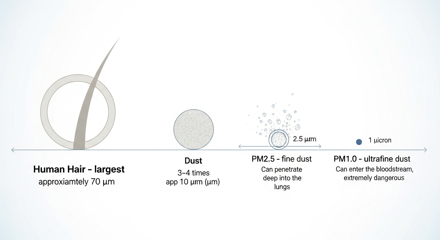 Sơ đồ minh họa kích thước của sợi tóc, hạt bụi thông thường, PM2.5 và PM1.0, nhấn mạnh sự nhỏ bé và nguy hiểm của bụi mịn.