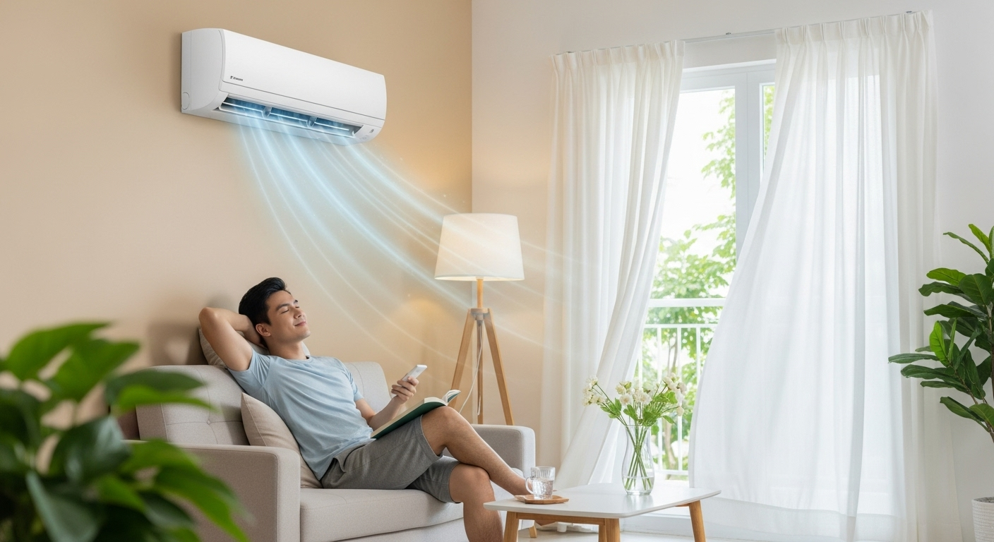 Một người dùng đang thoải mái trong phòng có điều hòa, thể hiện sự dễ chịu