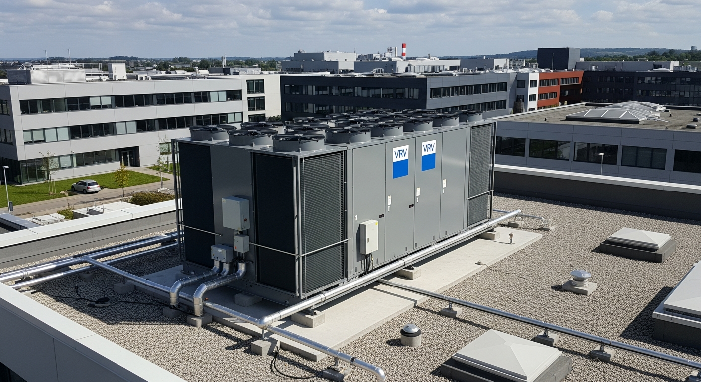 Hình ảnh một dàn nóng VRV công suất lớn được lắp đặt trên tầng mái của tòa nhà văn phòng trong KCN