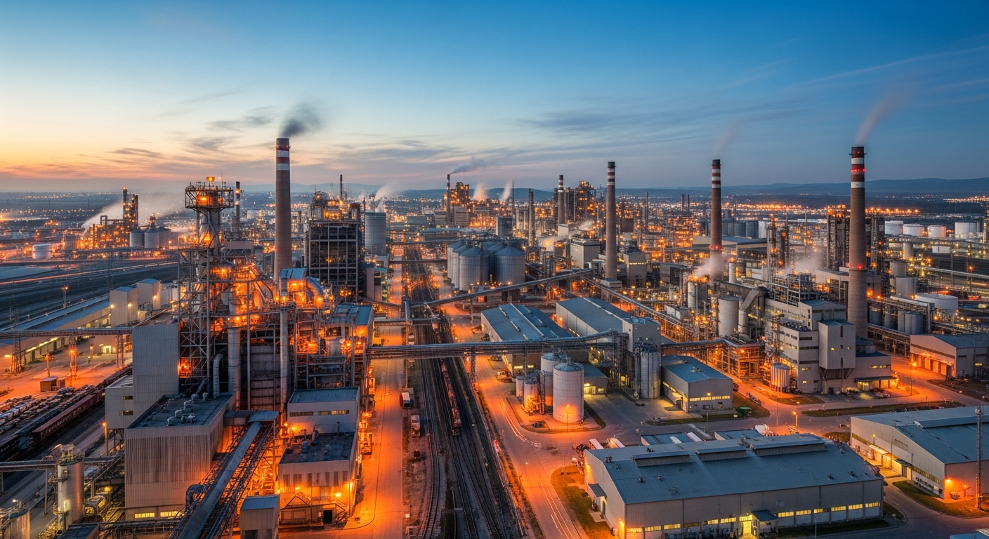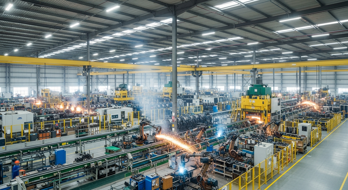 Hình ảnh tổng quan một nhà xưởng sản xuất hiện đại, minh họa quy mô và tải nhiệt lớn của không gian.