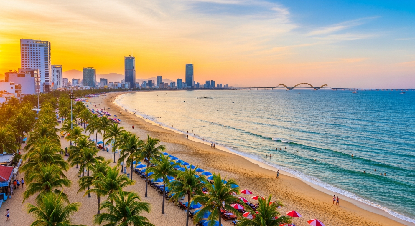 Toàn cảnh thành phố Đà Nẵng với các khu dân cư, resort ven biển – nắng vàng, trời xanh.
