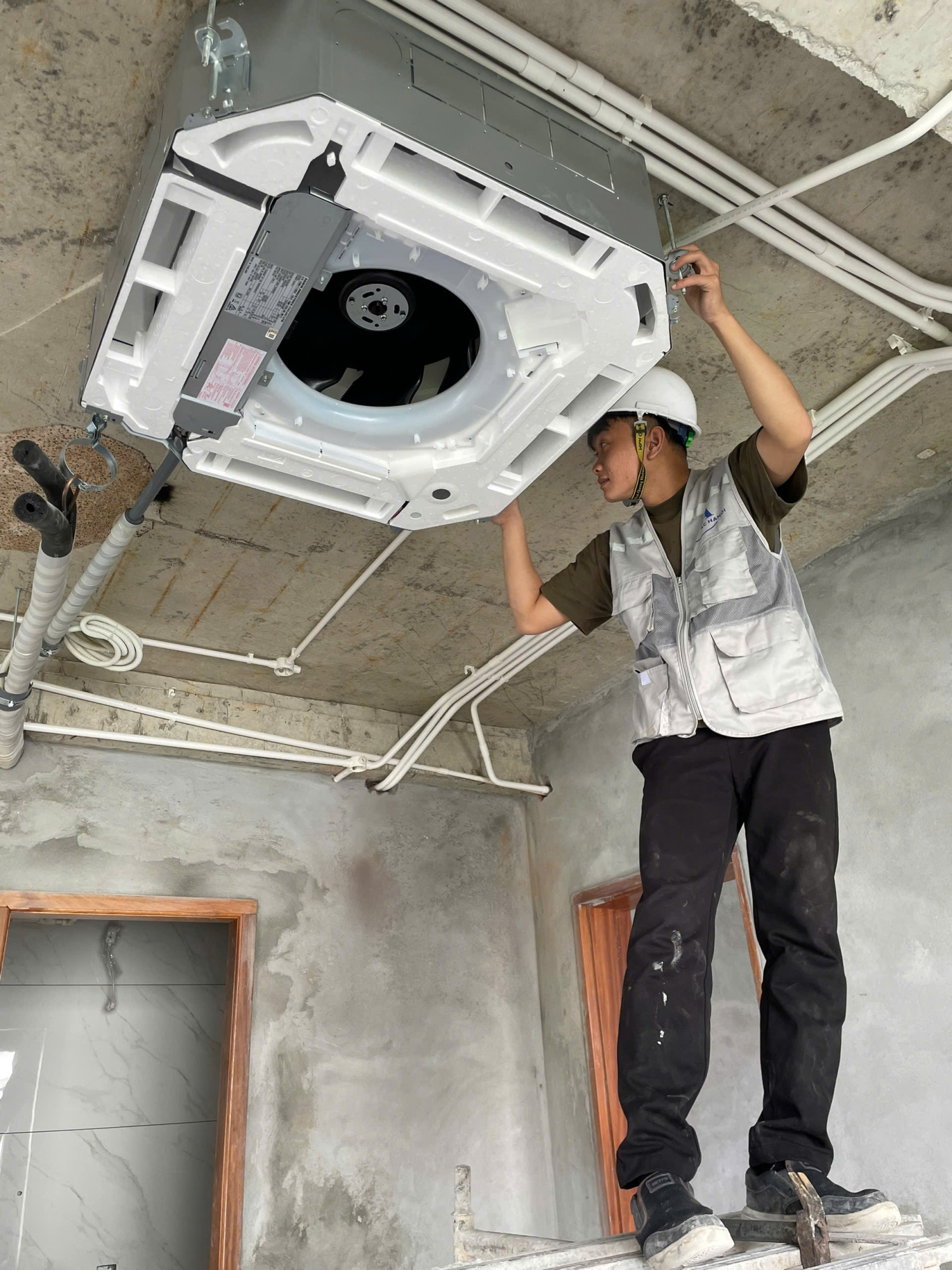 Kỹ thuật viên lắp đặt điều hòa trong căn hộ hiện đại tại Hải Phòng, ánh sáng tự nhiên, thiết bị gọn gàng, sạch sẽ.