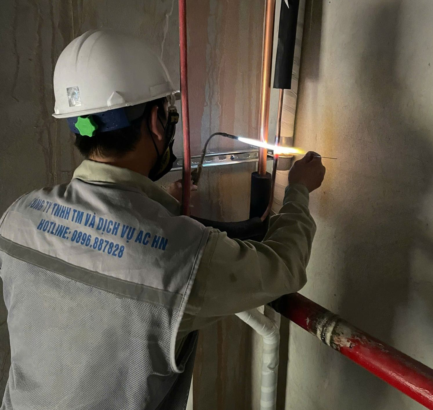 Cận cảnh một thợ kỹ thuật đang thao tác hàn ống ga