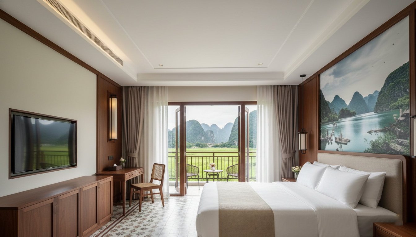 Hình ảnh một khách sạn boutique hoặc homestay cao cấp ở Ninh Bình. Bên trong phòng, dàn lạnh điều hòa đã được giấu gọn gàng trên trần, chỉ còn thấy cửa gió nhỏ (slot diffuser) tinh tế, thể hiện tính thẩm mỹ cao của hệ thống VRV/Multi.