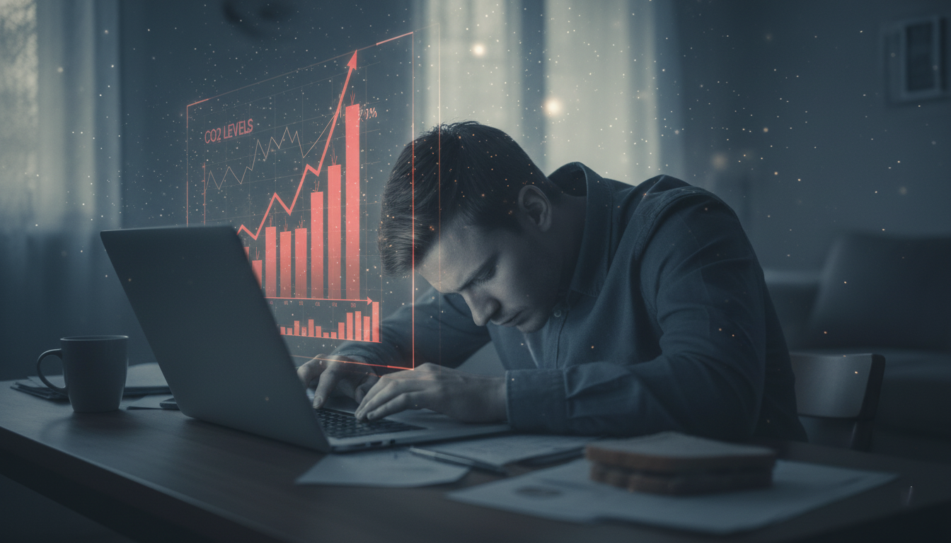 Một người làm việc tại nhà đang mệt mỏi tựa đầu vào bàn làm việc, xung quanh là biểu đồ minh họa nồng độ CO2 đang tăng cao (màu đỏ) và các hạt bụi lơ lửng trong không khí. Ánh sáng bức tranh hơi u ám để nhấn mạnh sự ngột ngạt.