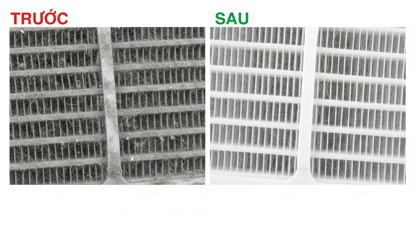 Ảnh so sánh "Trước và Sau" của một màng lọc điều hòa. Một bên xám xịt, đầy bụi bẩn và một bên sạch sẽ, sáng bóng. Kèm theo dòng chữ cảnh báo về vi khuẩn ẩn nấp.