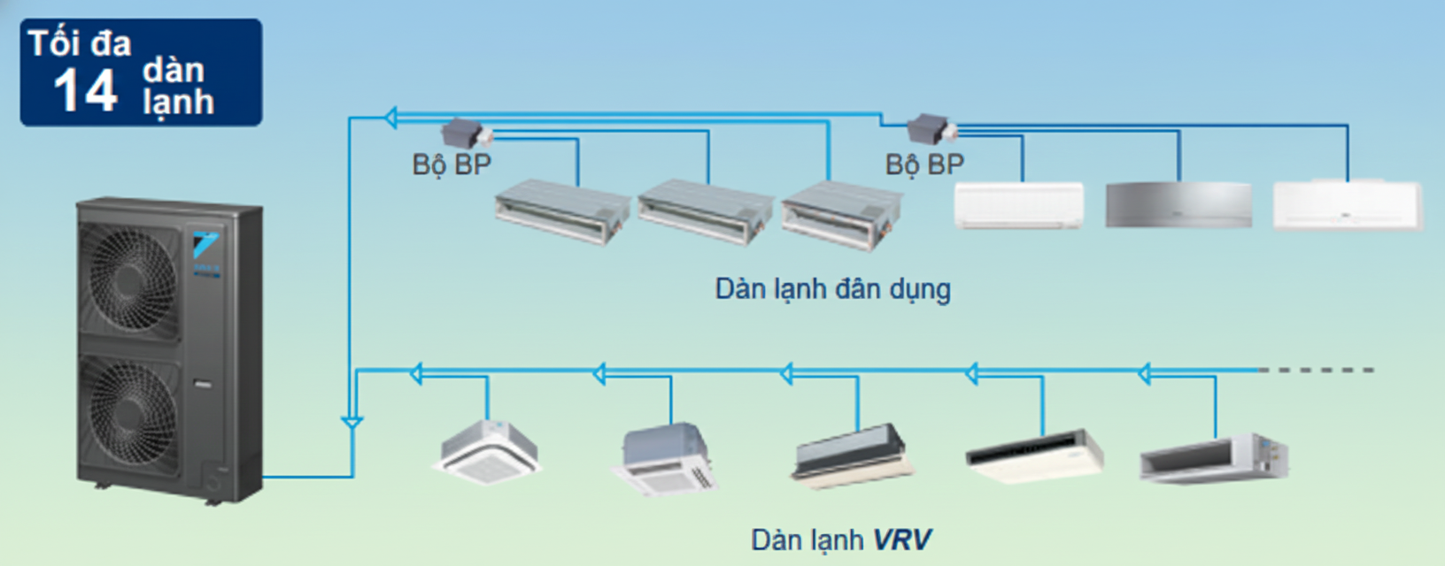 Chênh Lệch Độ Cao: Hệ thống cho phép chênh lệch độ cao đáng kể (thường khoảng 50m giữa dàn nóng và dàn lạnh xa nhất, và 15m giữa các dàn lạnh), lý tưởng cho các tòa nhà cao tầng.