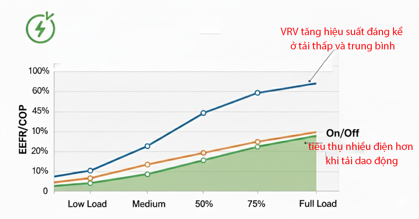 Biểu đồ so sánh hiệu suất năng lượng EER/COP của hệ thống Inverter (VRV) so với hệ thống On/Off truyền thống ở các mức tải khác nhau