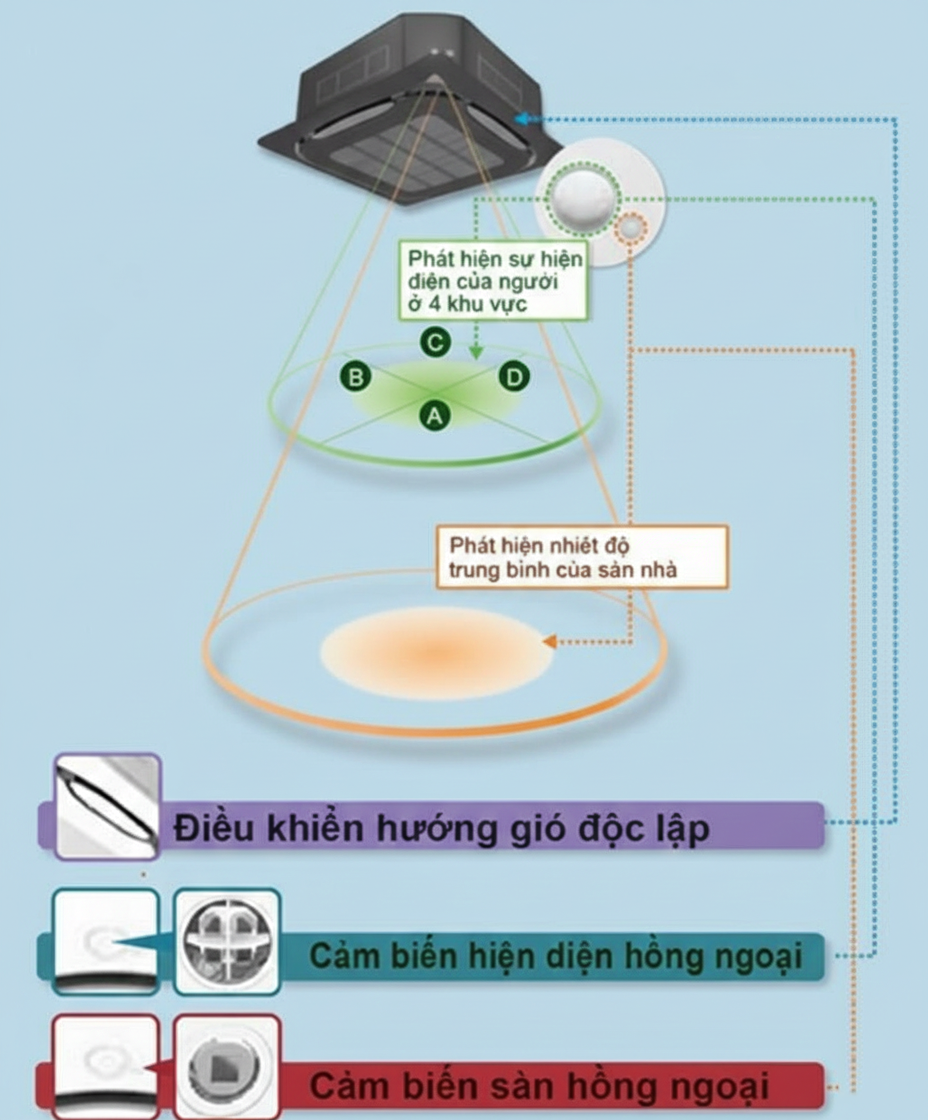 Âm trần Cassette: Thiết kế 2 hướng, 4 hướng hoặc luồng gió tròn (Round Flow) phân bổ không khí đều và tối ưu tính thẩm mỹ.