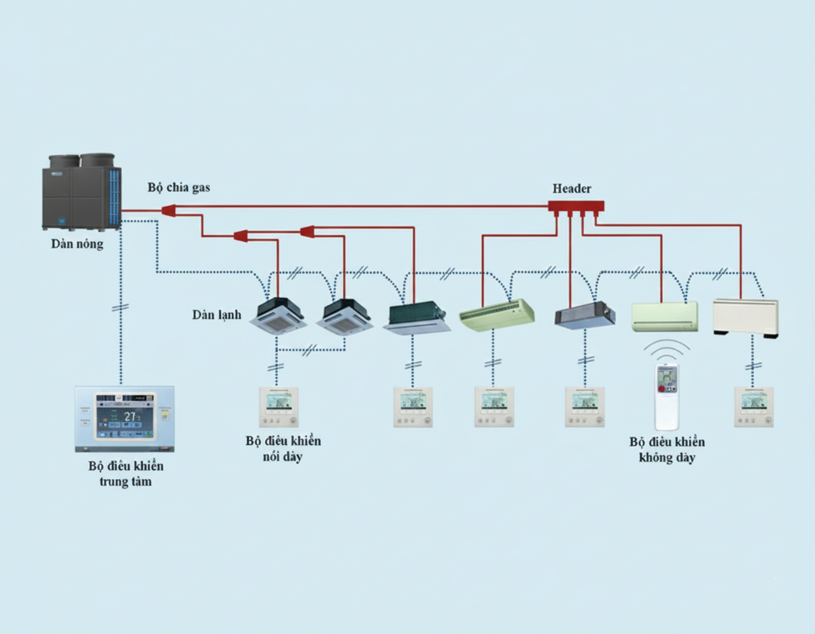 Hệ thống 3 Ống (Heat Recovery): Đây là cấu hình đặc trưng cho các tòa nhà có nhu cầu làm lạnh và sưởi ấm đồng thời (ví dụ: các phòng hướng Nam cần làm mát, các phòng hướng Bắc cần sưởi ấm).