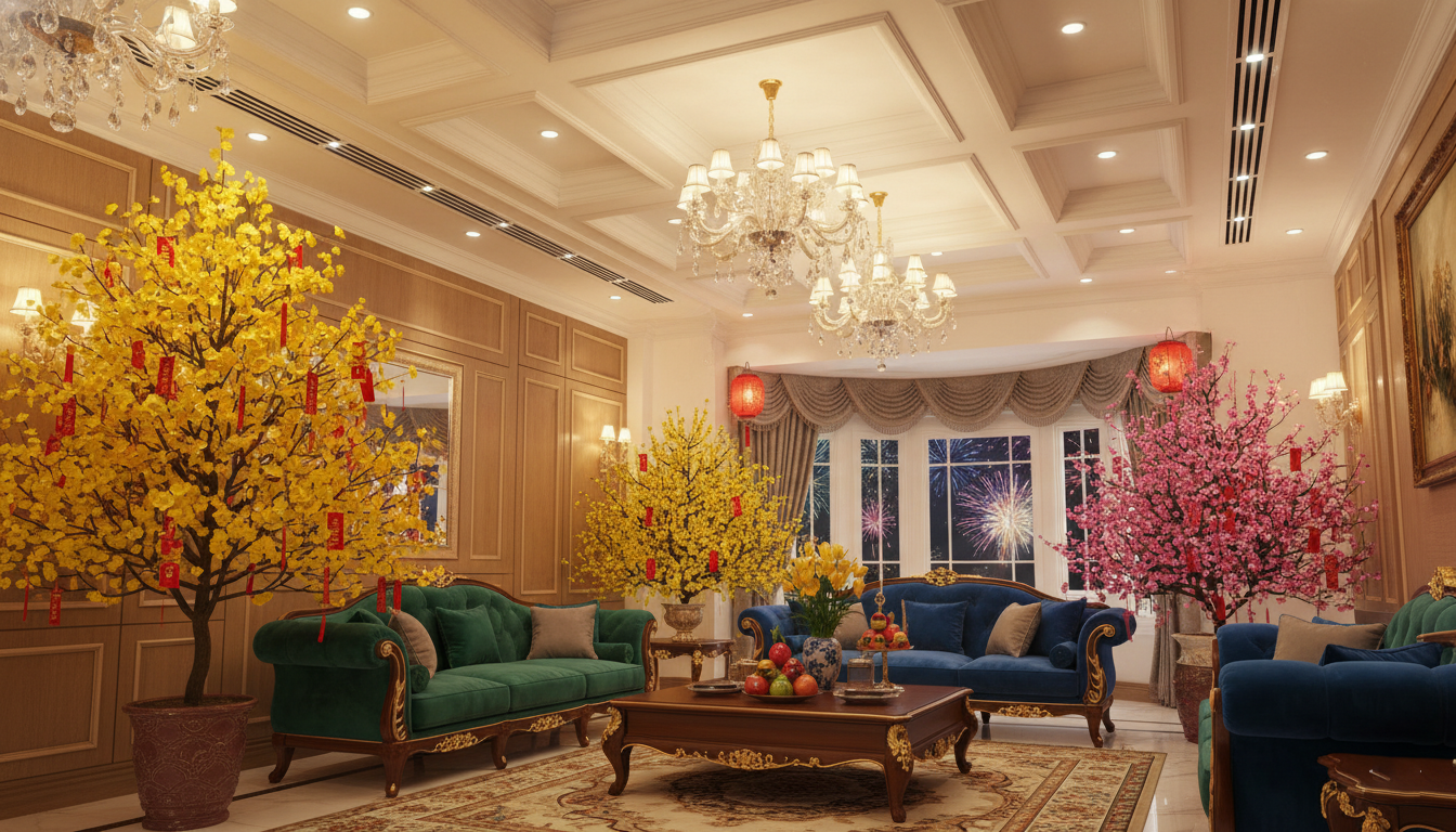 Phòng khách biệt thự lung linh ánh đèn Tết với cây mai, cây đào, phía trên trần thạch cao là các khe gió điều hòa âm trần được thiết kế thanh mảnh, tinh tế, hòa quyện hoàn hảo vào phong cách nội thất tân cổ điển.