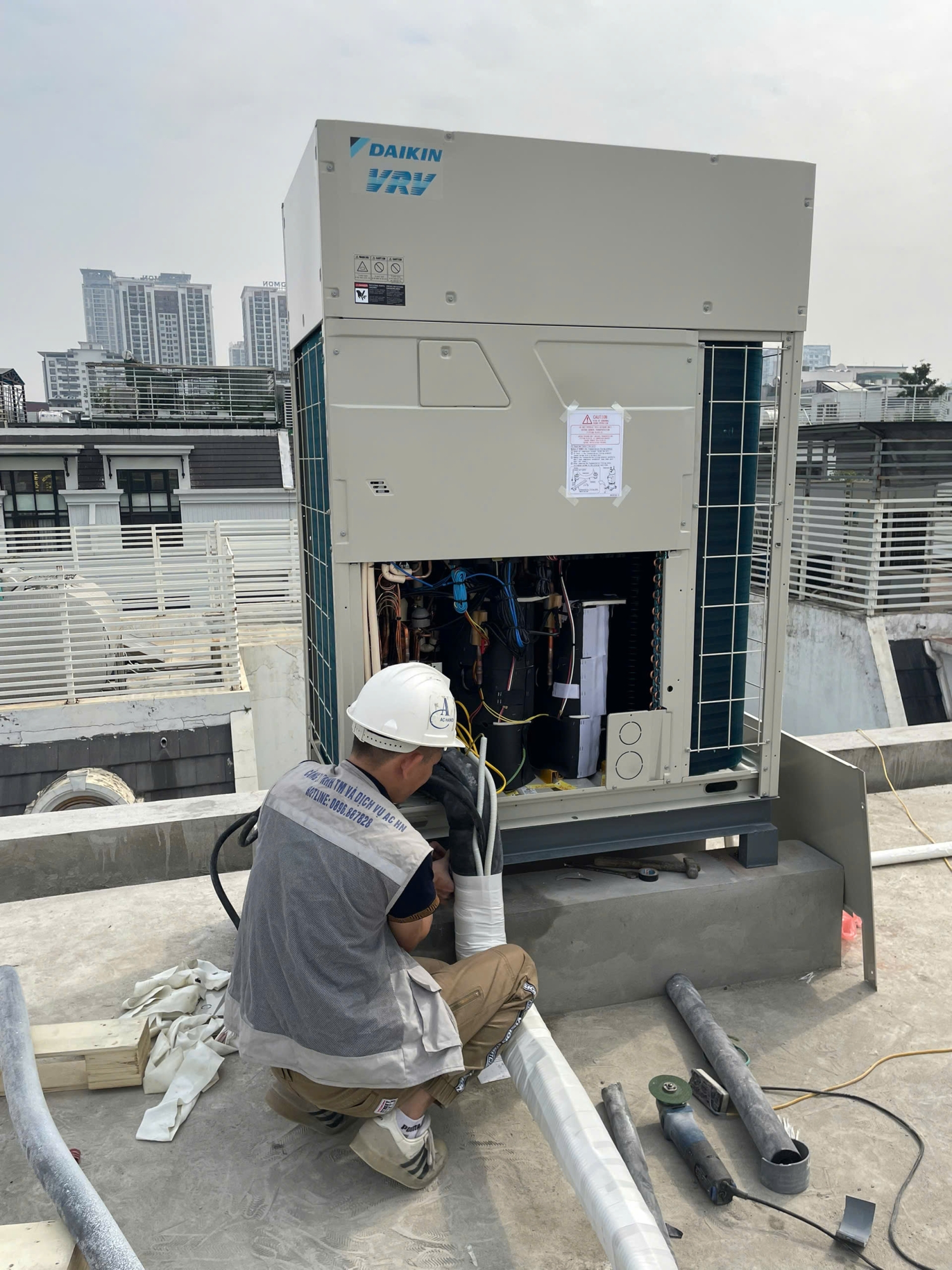 Hình ảnh nhân viên kỹ thuật của ACHANOI đang lắp đặt dàn nóng điều hòa trung tâm