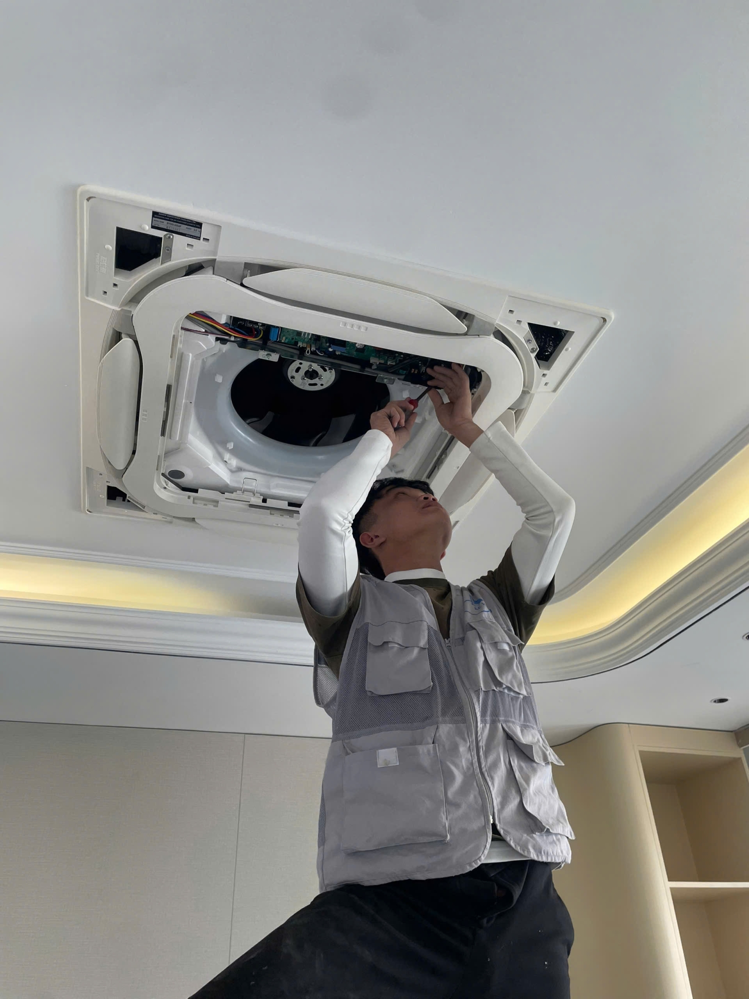 Hình ảnh kỹ thuật viên đang vệ sinh định kỳ điều hòa trung tâm âm trần