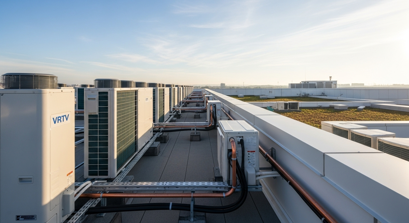 Các hệ thống VRV/VRF thường được ưu tiên nhờ chỉ cần một dàn nóng cho nhiều dàn lạnh, giảm diện tích kỹ thuật và đường ống. Dàn lạnh âm trần nối ống gió giúp giấu thiết bị, tăng tính thẩm mỹ.