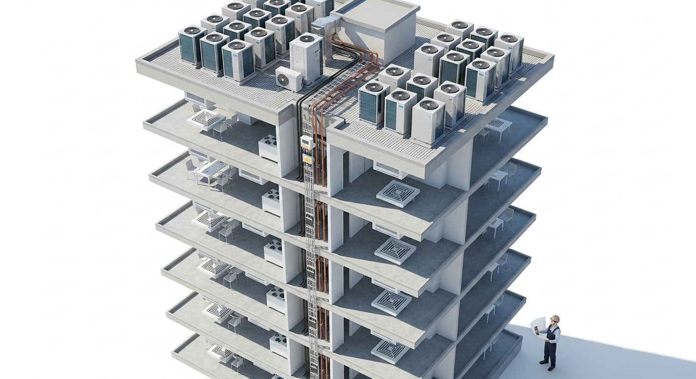 Sơ đồ tổng thể hệ thống điều hòa trung tâm VRV/VRF trong tòa nhà – thể hiện dàn nóng tập trung trên mái và các dàn lạnh âm trần bên trong